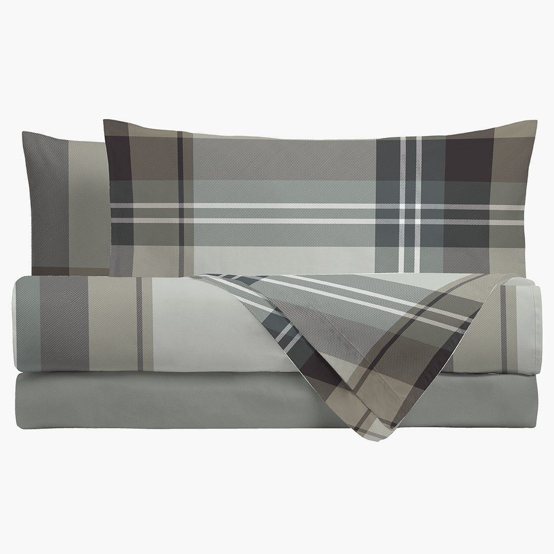Qualità e morbidezza assicurano una notte assolutamente confortevole e calda; il puro cotone, lavorato tra note d’ordito e trame irregolari, declinato nei colori autunnali, grazie alla sua composizione 100% naturale, rende questo completo intramontabile.