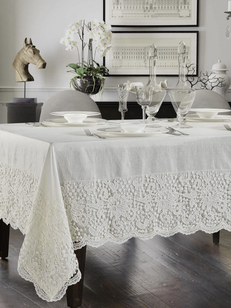 Tovaglia in puro lino (stone wash o lino vecchio telaio) con pizzo “sontuoso deco” sui quattro lati.